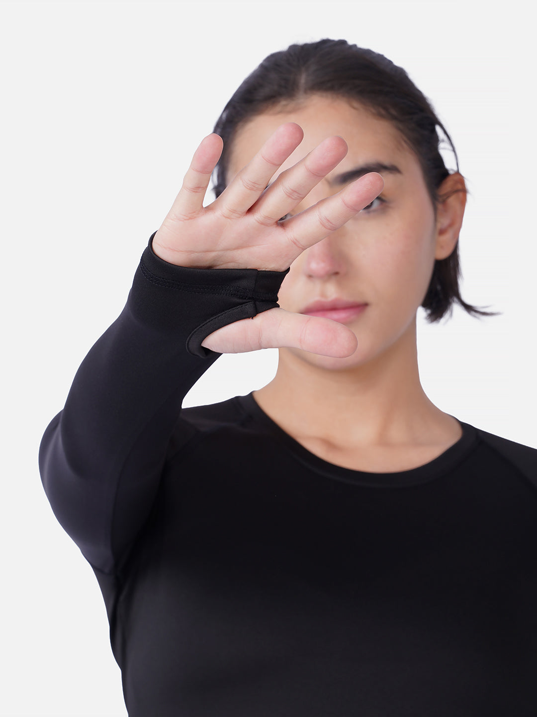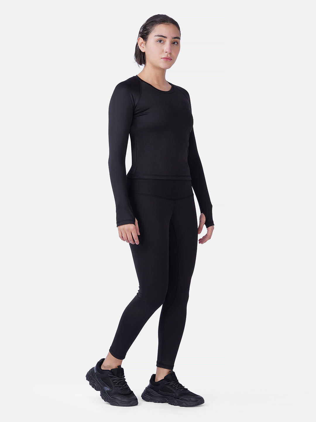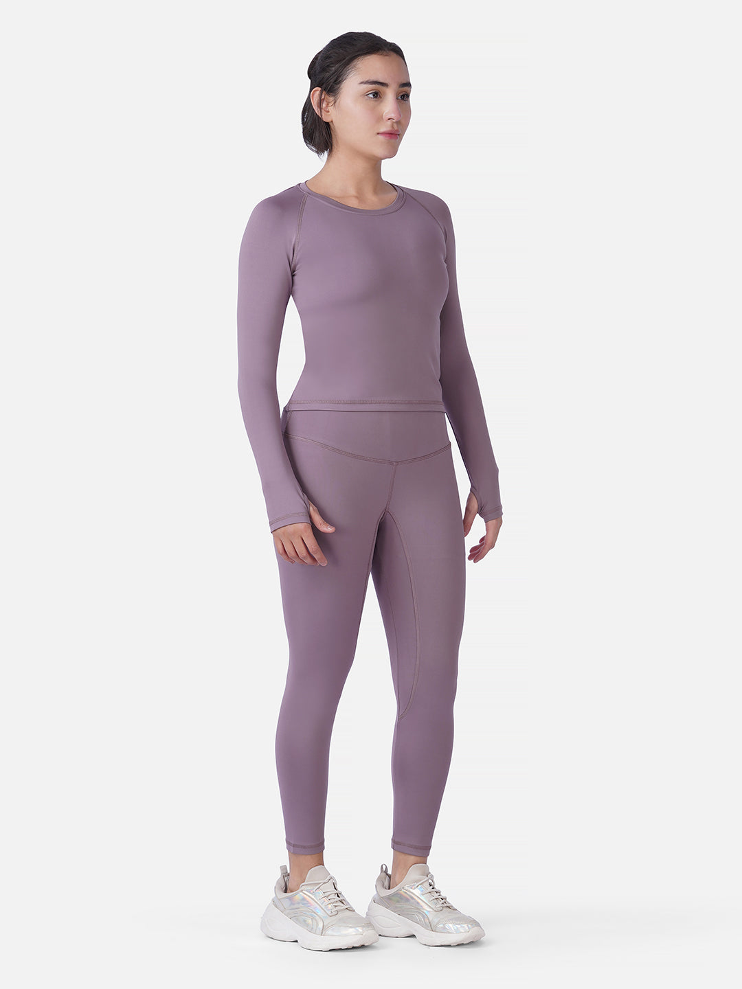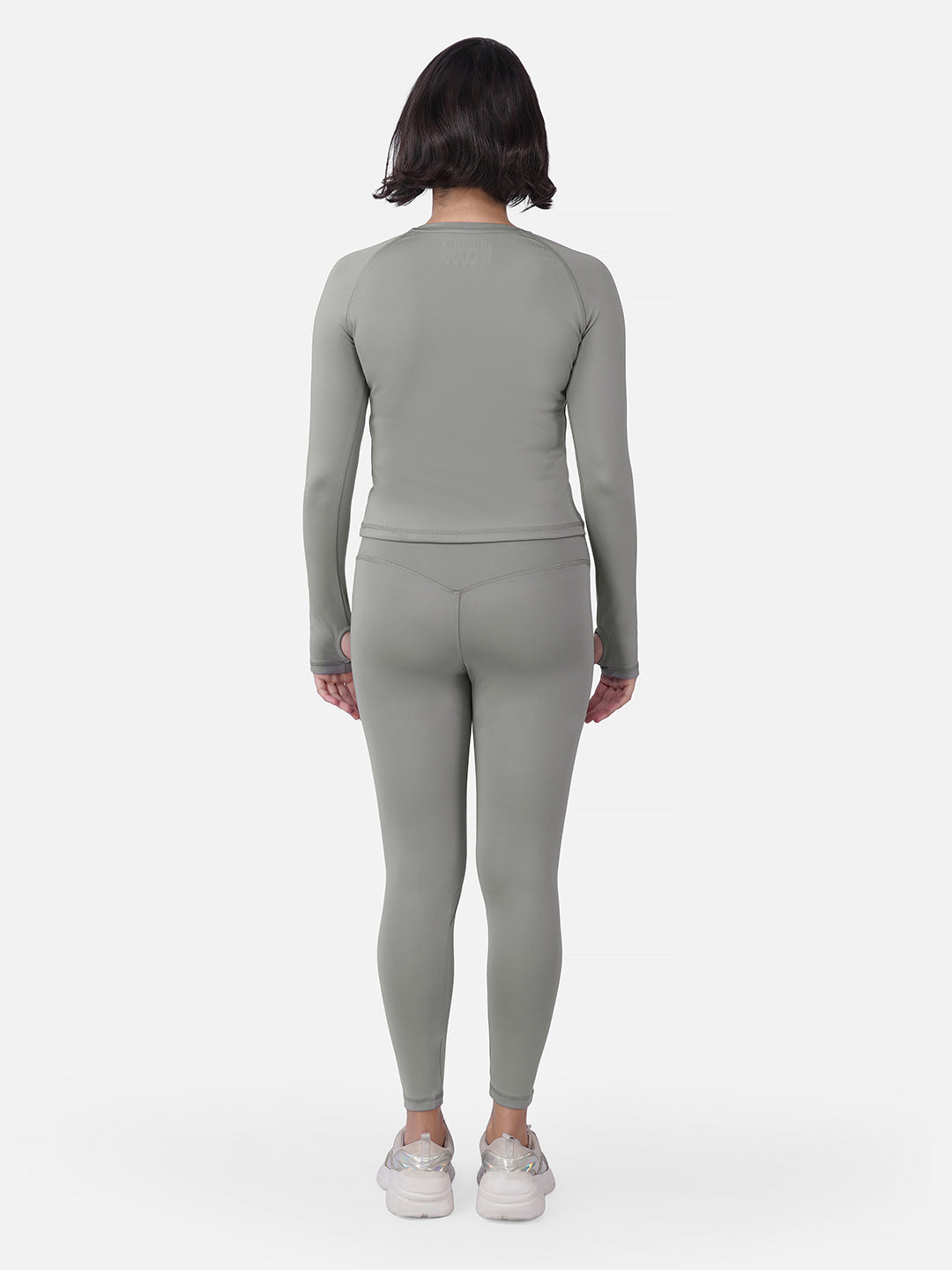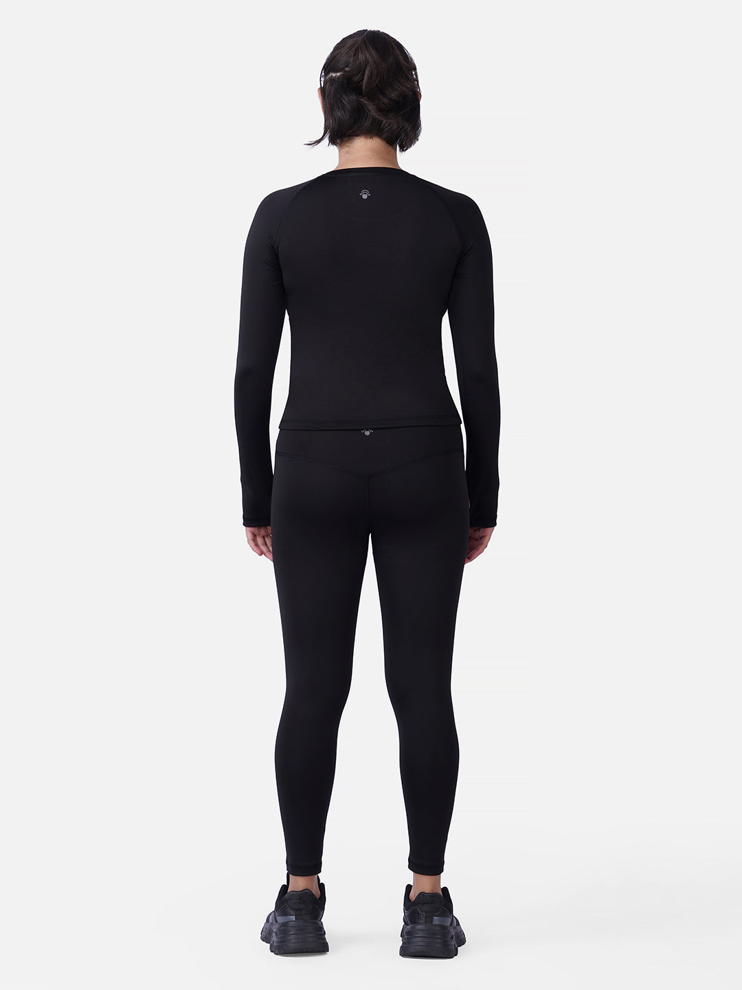 A clean, sculpting co-ord set that feels like a second skin. The long-sleeve fitted top features built-in thumbholes to keep sleeves in place while you move. The high-waist leggings contour beautifully and include a hidden waistband pocket to hold a card or key without getting in the way. Ideal for workouts, yoga, walks, or whenever you want effortless comfort with a polished look.