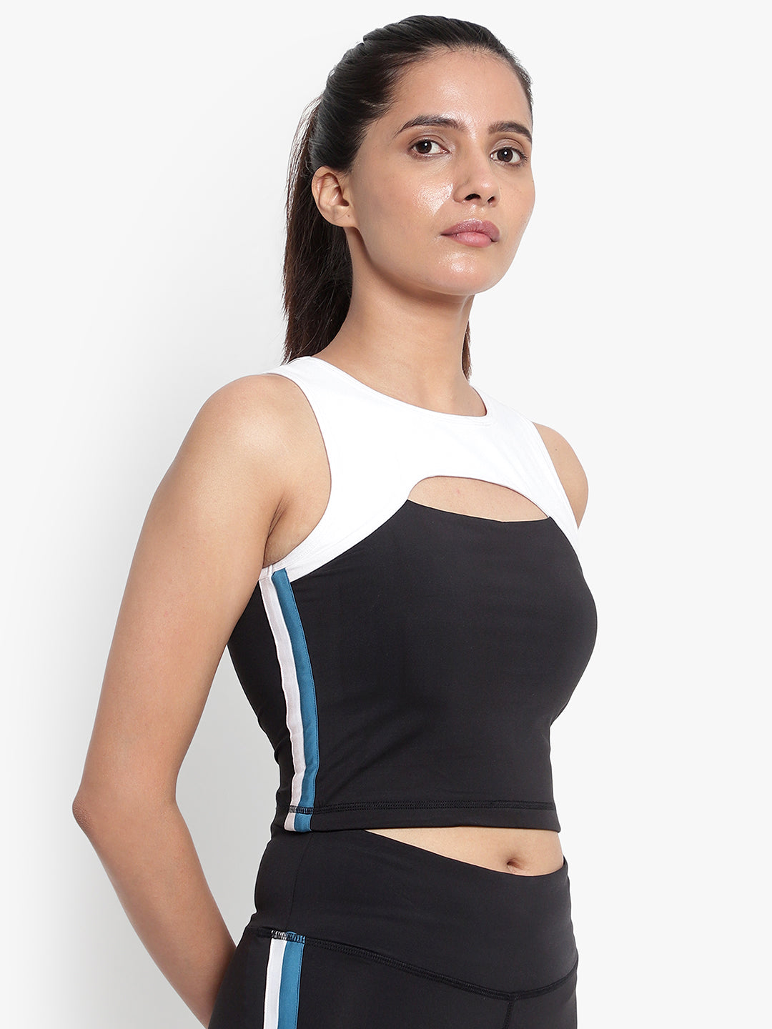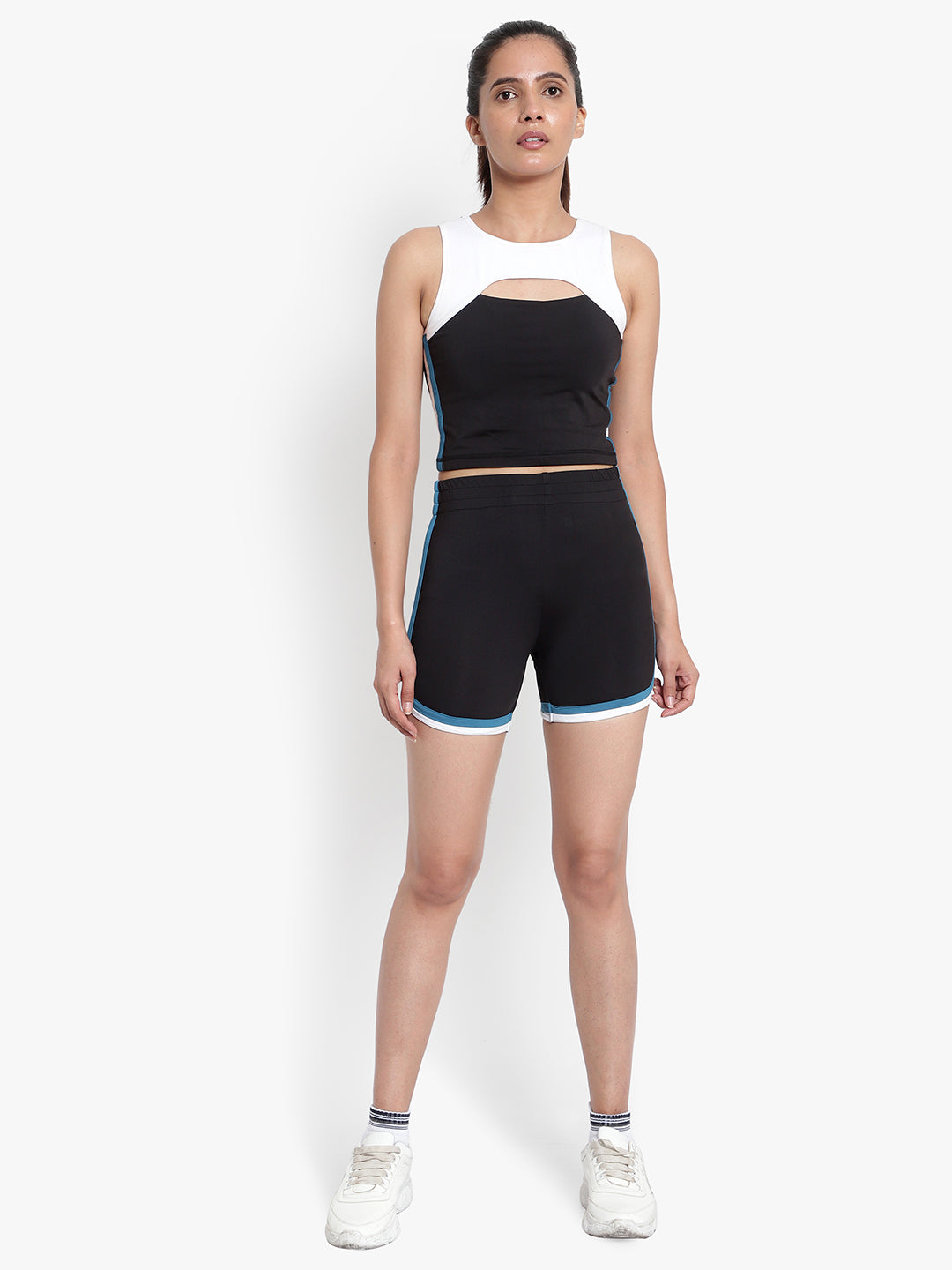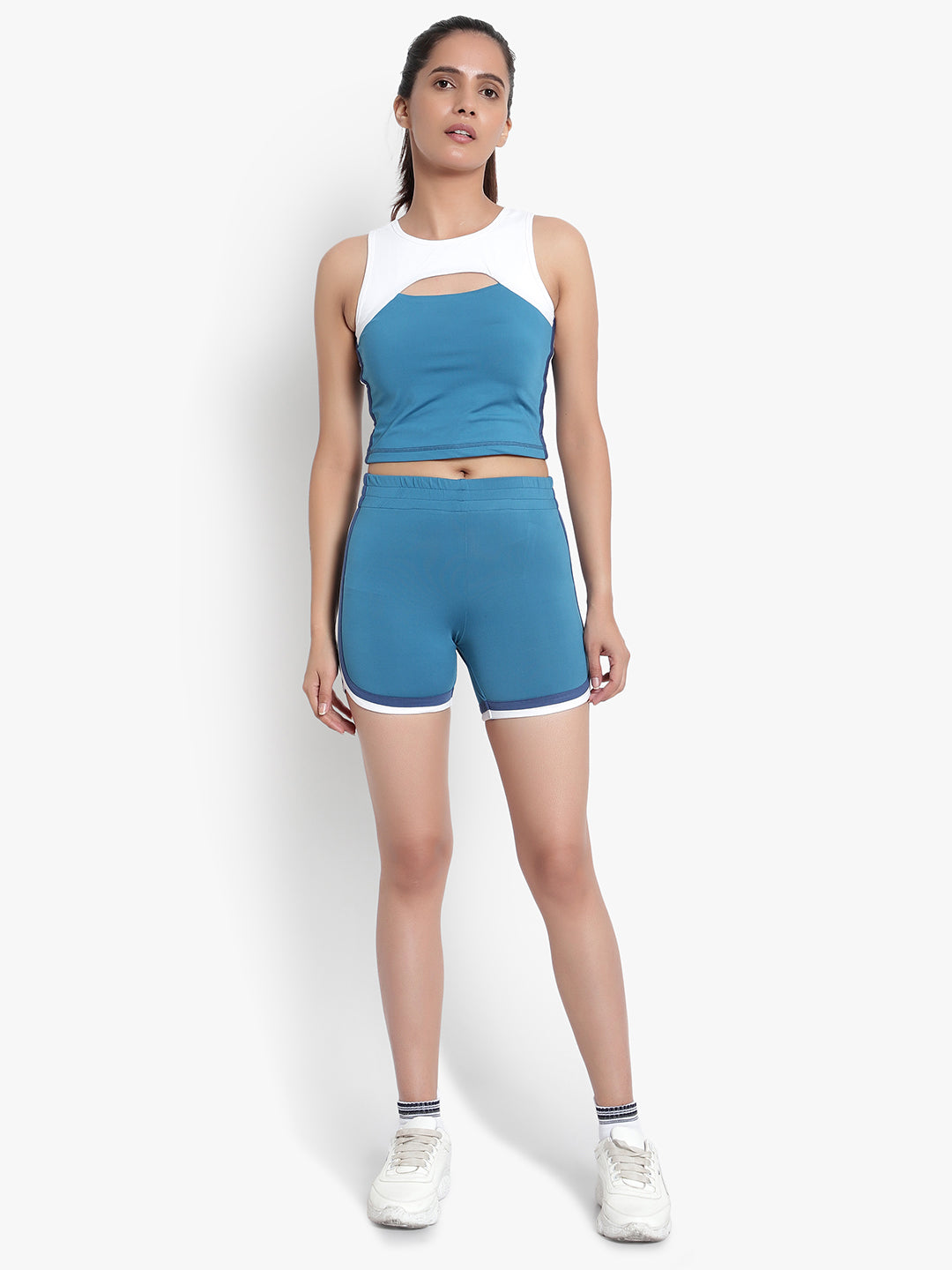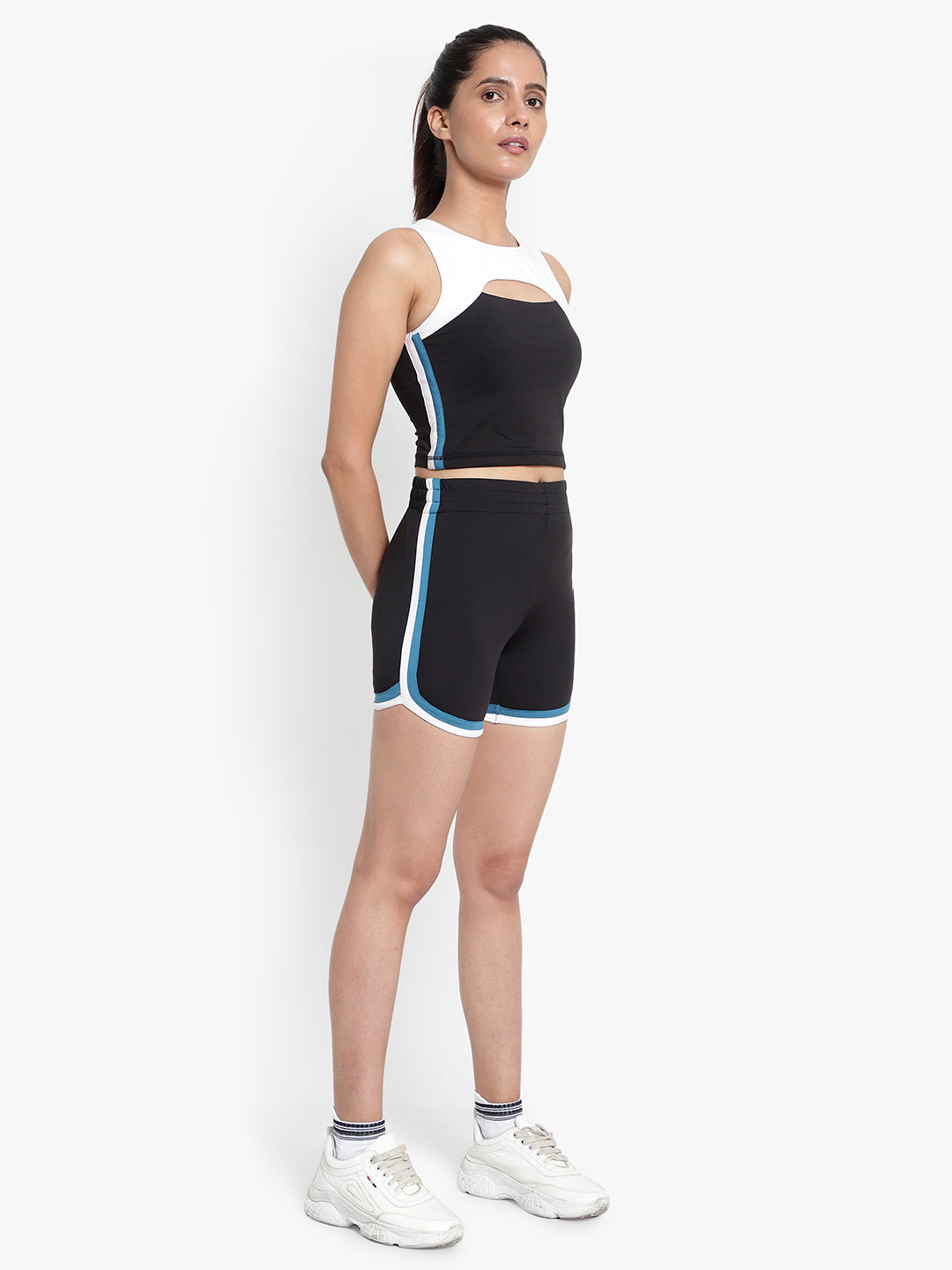 A crewneck Top in a short silhouette and updated with cutout at the neckline, teamed with sporty & chic Retro shorts, ready for street or studio.