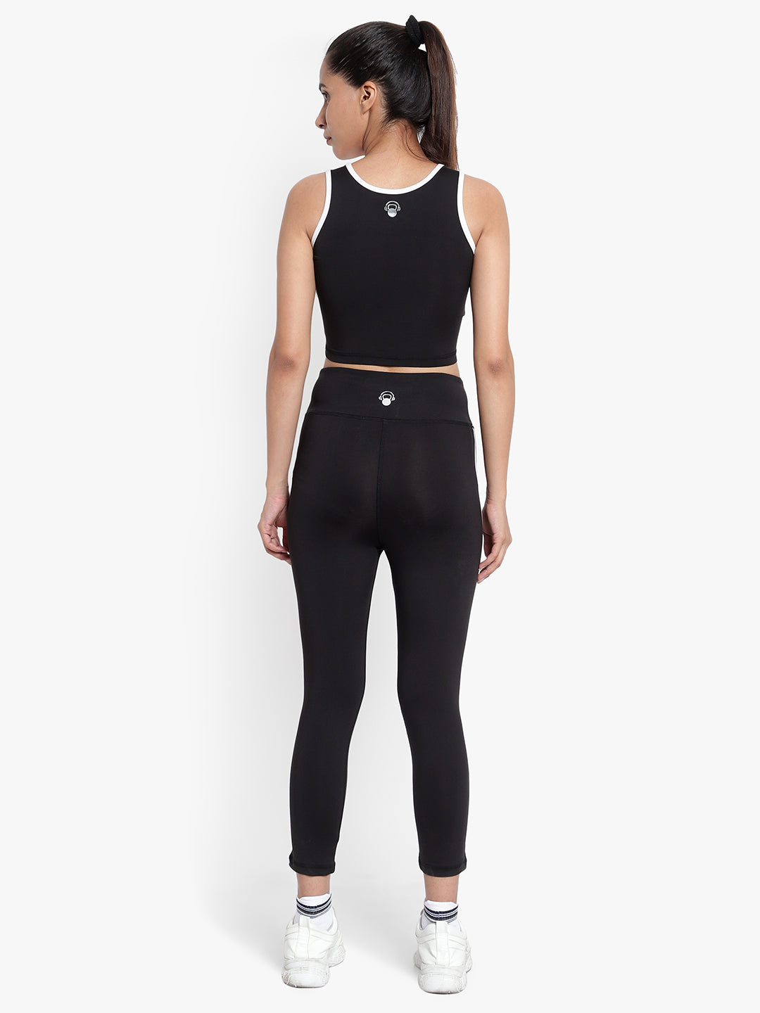 A crewneck Top in a short silhouette and updated with cutout at the neckline, teamed with stylish knit leggings with a hugging fit, colour stripes down the sides and a front & back logo detail.
