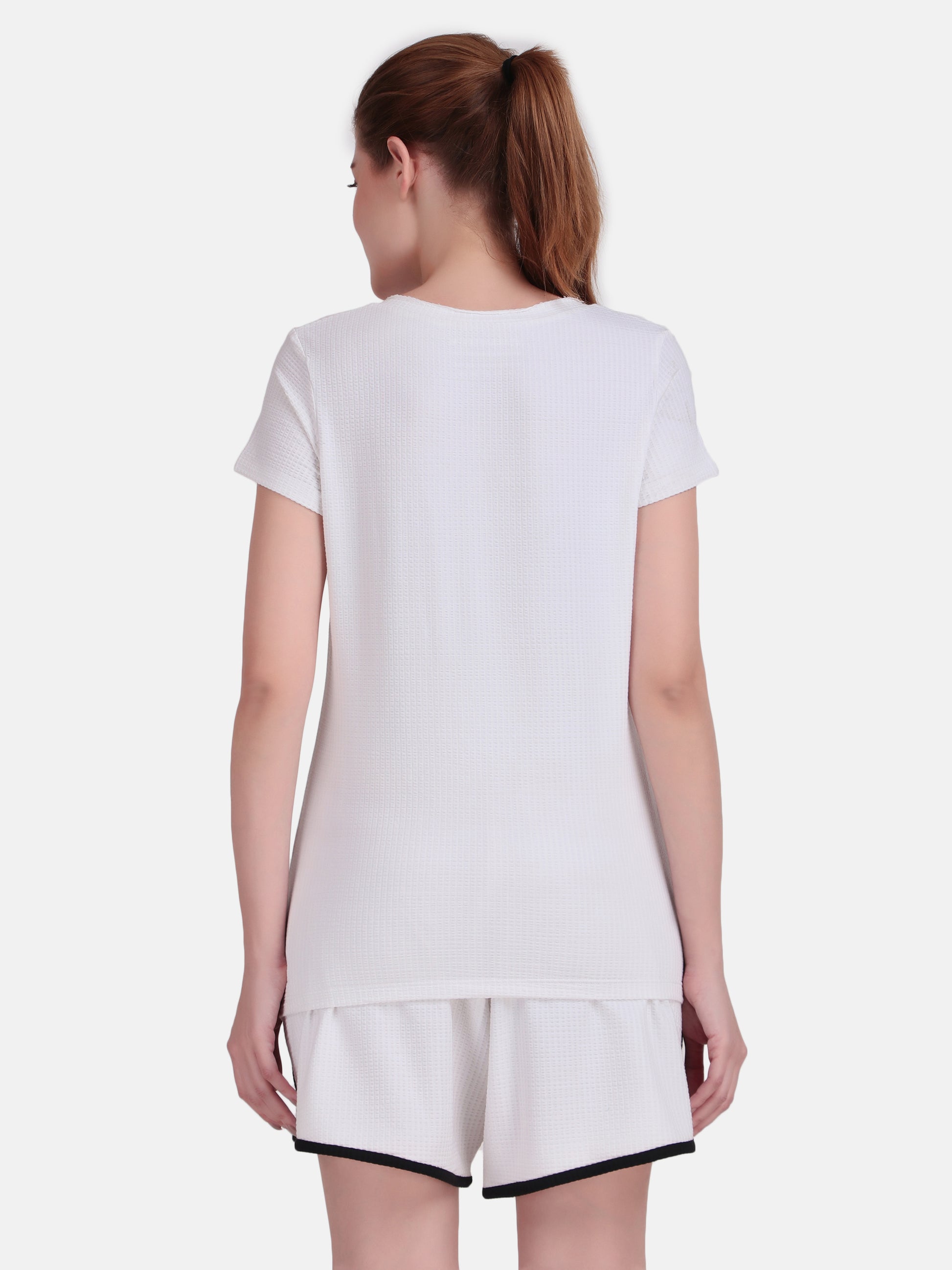 With its flattering neckline and minimal design, the Drift Tee pairs perfectly with shorts, joggers, or flared pants — your everyday comfort, elevated.