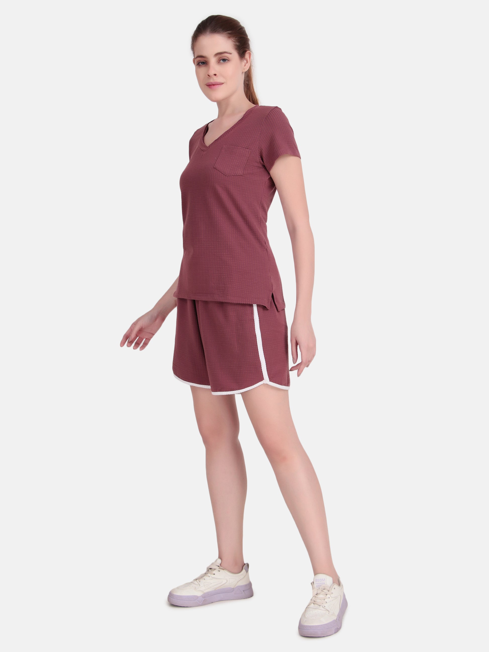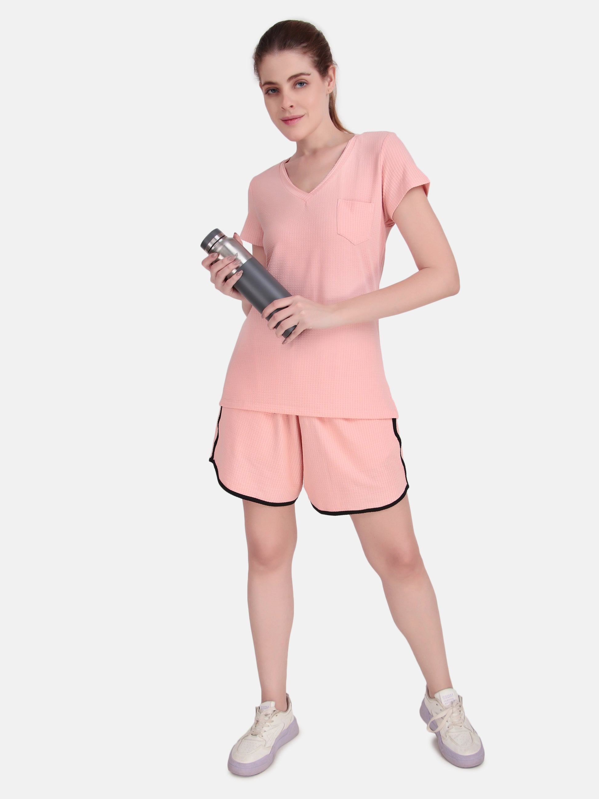 Soft, structured, and endlessly wearable — this V-neck tee features tonal fabric detailing around the neckline and a comfortable, relaxed fit. The textured fabric feels airy yet supportive, designed to move with your day.