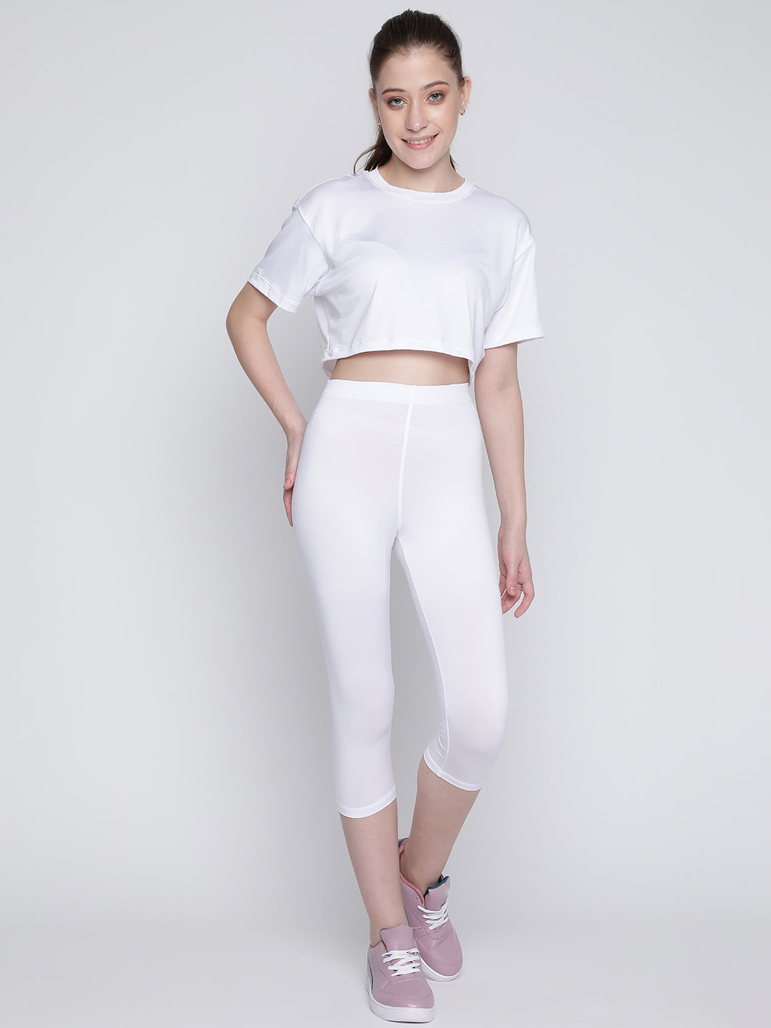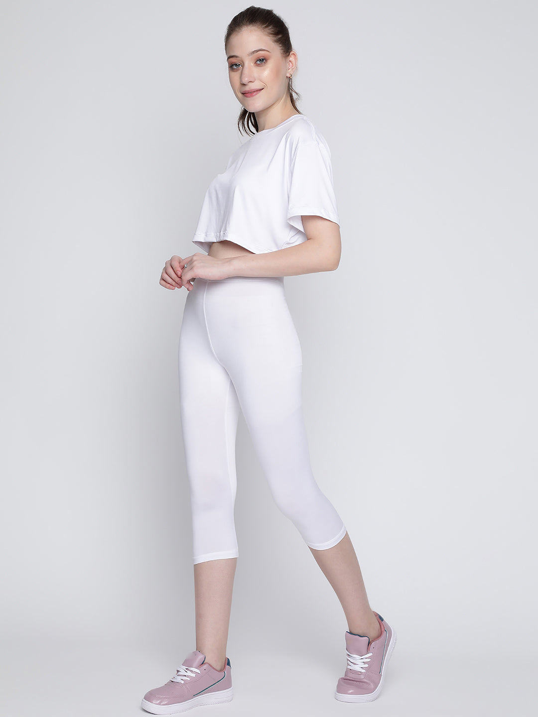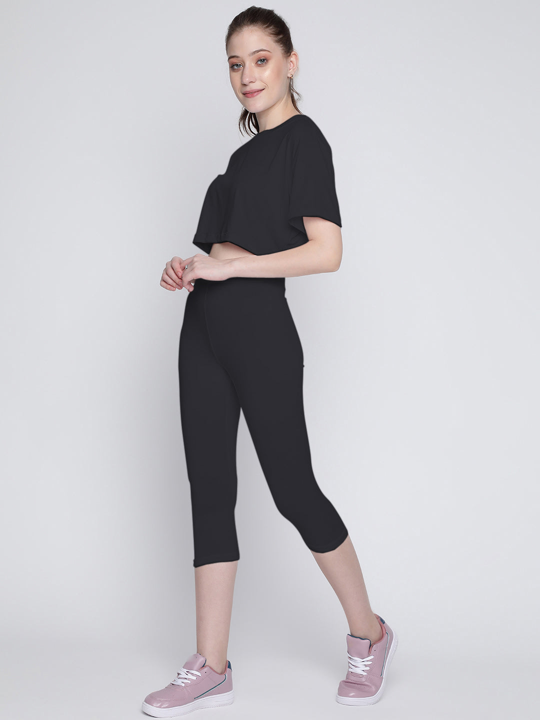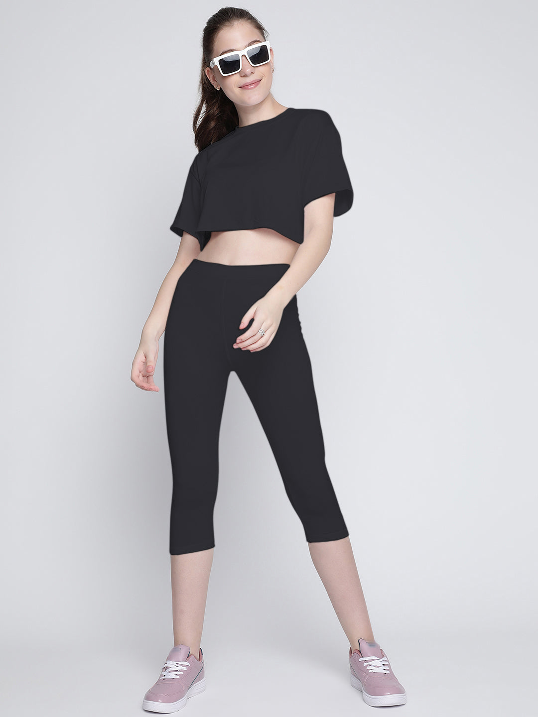 The boxy, cropped top in a loose fit, paired with the cool, casual and comfy above-ankle leggings, this set is a must have in your wardrobe.
