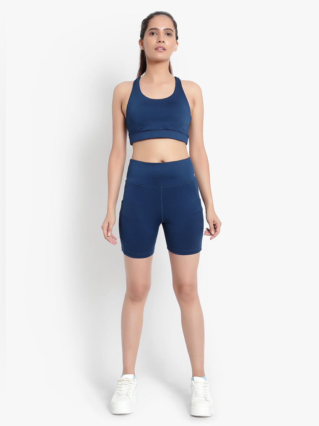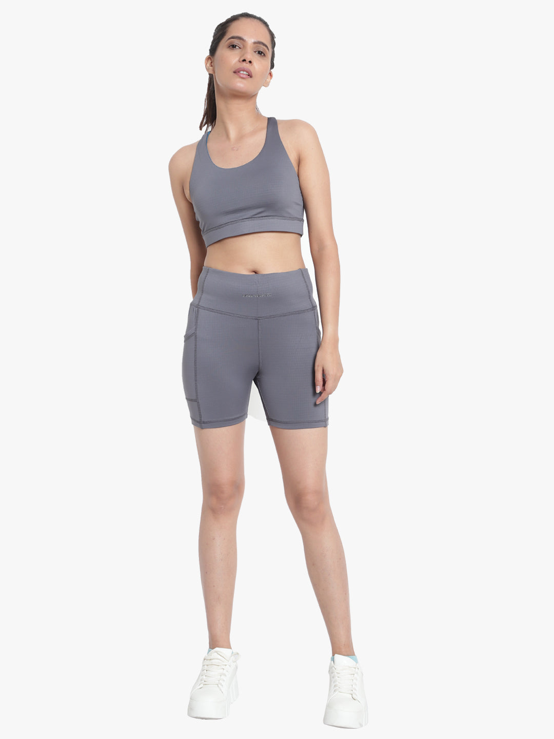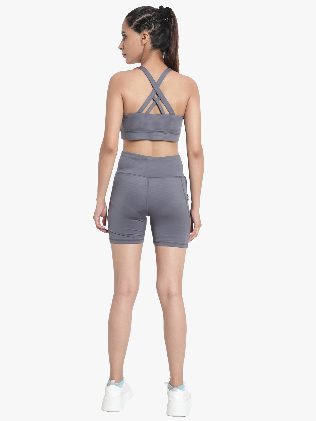 Criss-Cross back detailing gives the V-neck Bra its signature style, while the Shorts have side drop-in pockets, are High-rise, Soft and lightweight, Figure-hugging & Moisture-wicking.