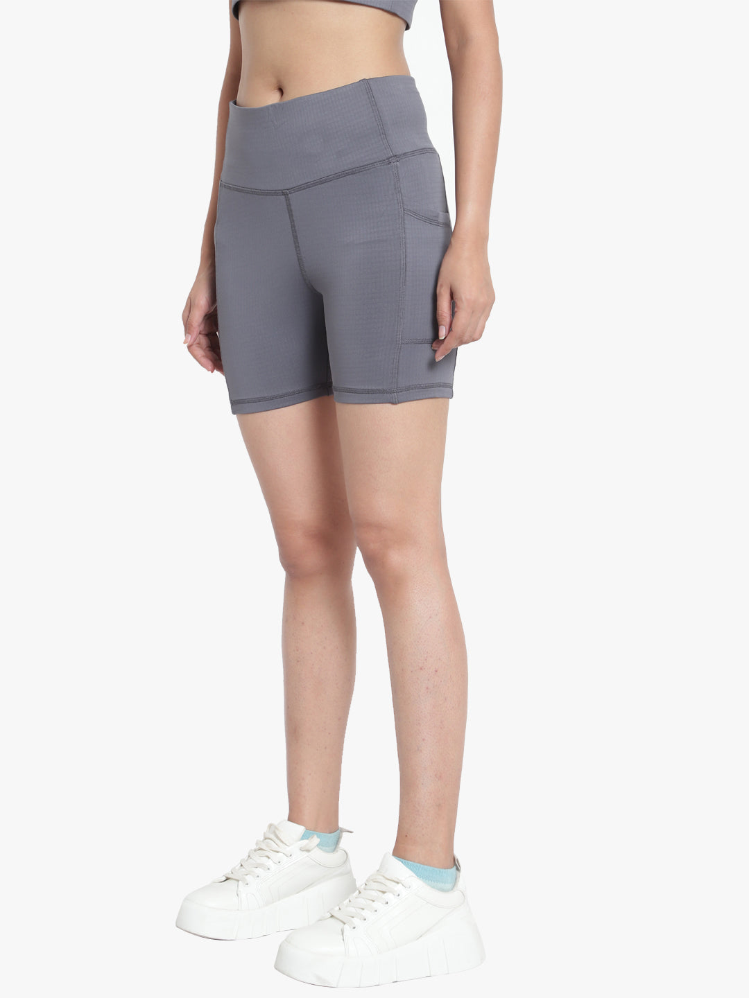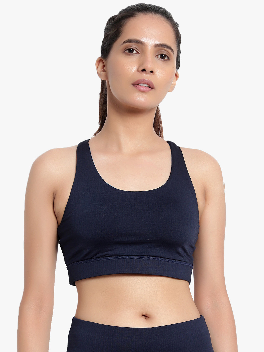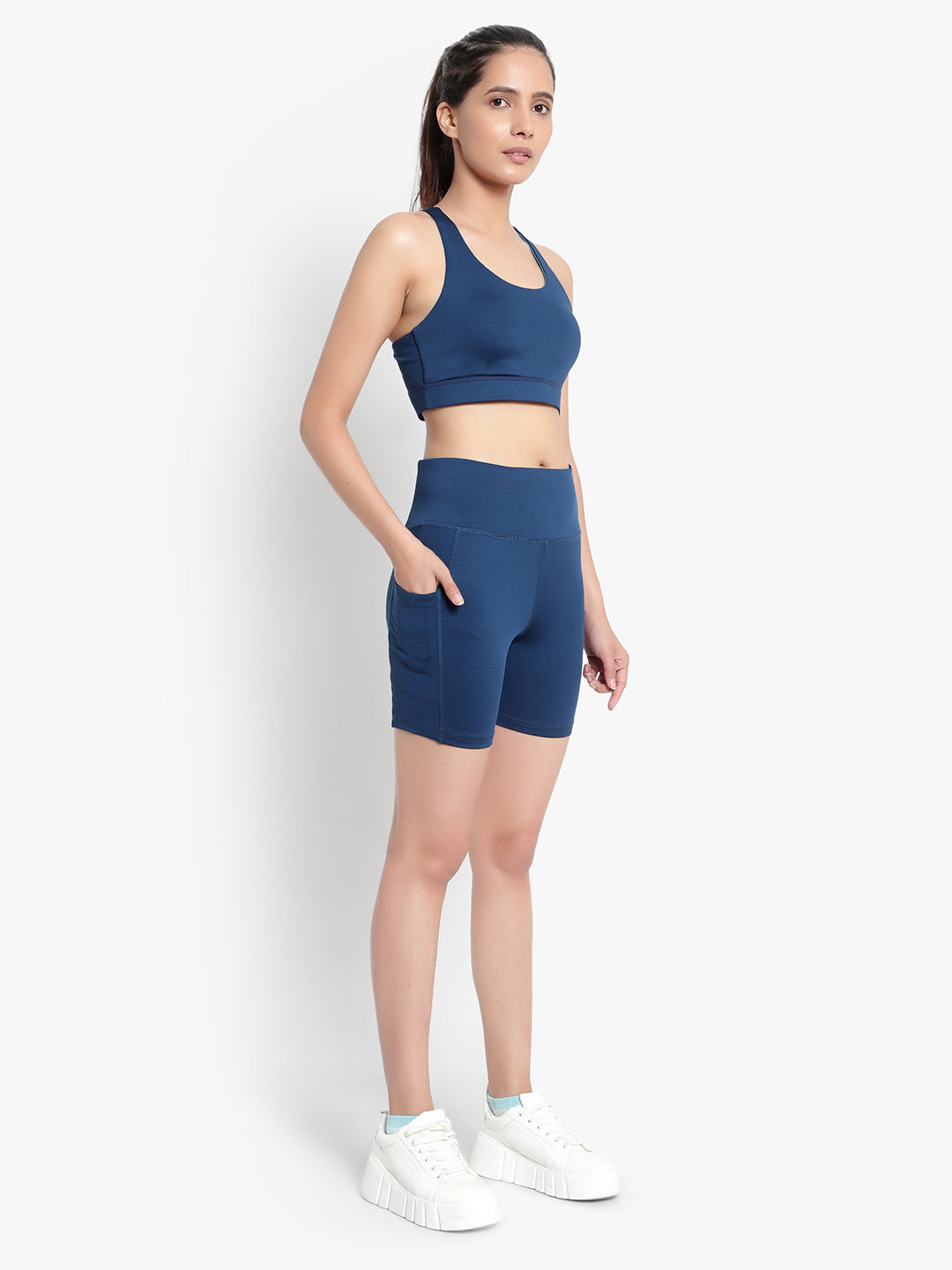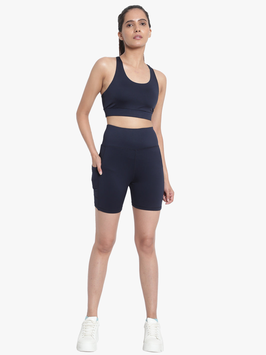 Criss-Cross back detailing gives the V-neck Bra its signature style, while the Shorts have side drop-in pockets, are High-rise, Soft and lightweight, Figure-hugging & Moisture-wicking.