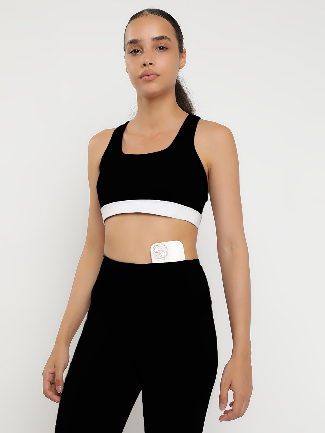 The Momentum Bra features removable cups and a supportive band, providing a secure fit for all activities. The back design allows for a full range of motion, while the moisture-wicking fabric keeps you dry and comfortable. The Momentum Leggings offer a high-waisted design for secure support and a compression fit that enhances performance. The moisture-wicking fabric keeps you dry, and a secret pocket in the front waistband is perfect for stashing your phone, cash, or cards.