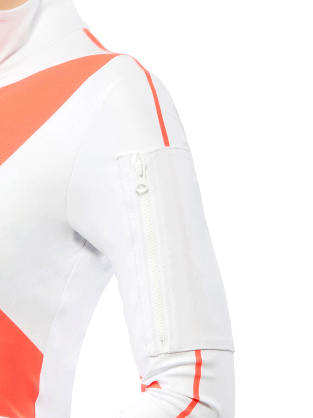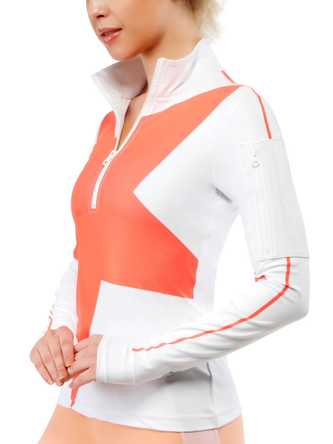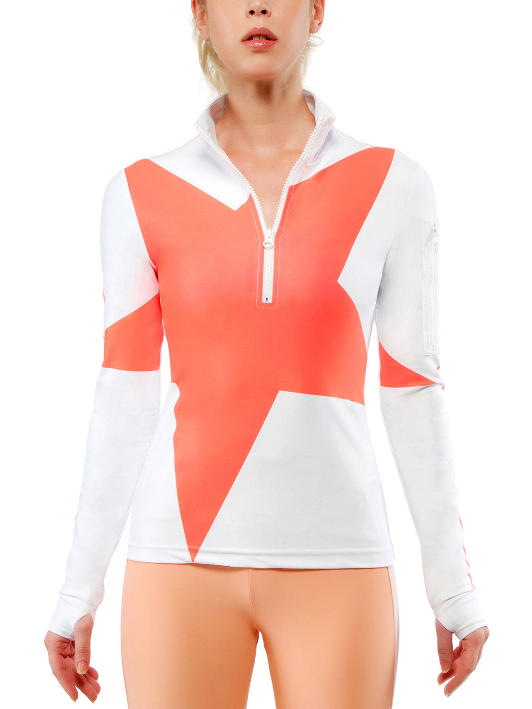 Adorn the neon orange star and feel like you own the world of pop. With a zip in front that offers adjustable coverage, it has thumb holes that keep the sleeves in place. The arm sleeve sports a cool zipper pocket for your cell phone.