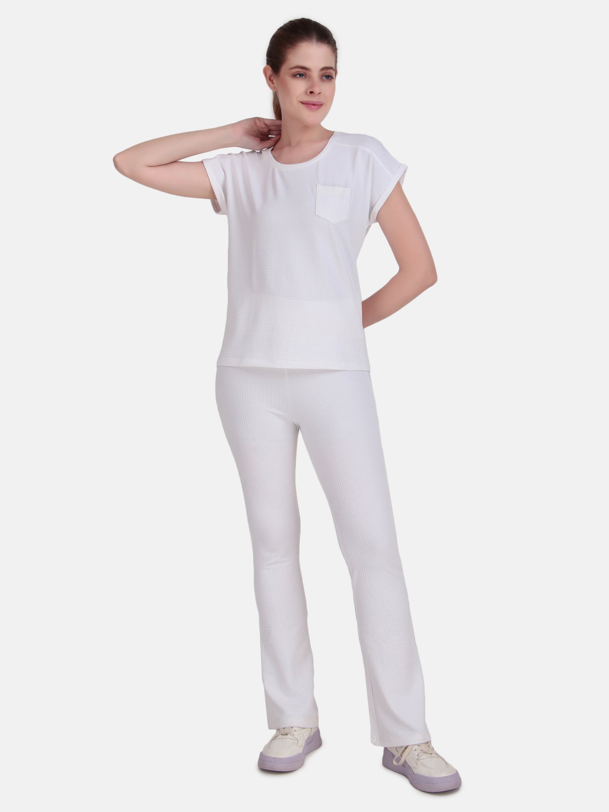 The rolled-sleeve tee with a neat chest pocket brings that casual, sporty edge, while the gently flared pants elongate your frame and let you move freely. Together, they create the perfect harmony of comfort, confidence, and contemporary cool — for workouts, lounging, or everyday wear.
