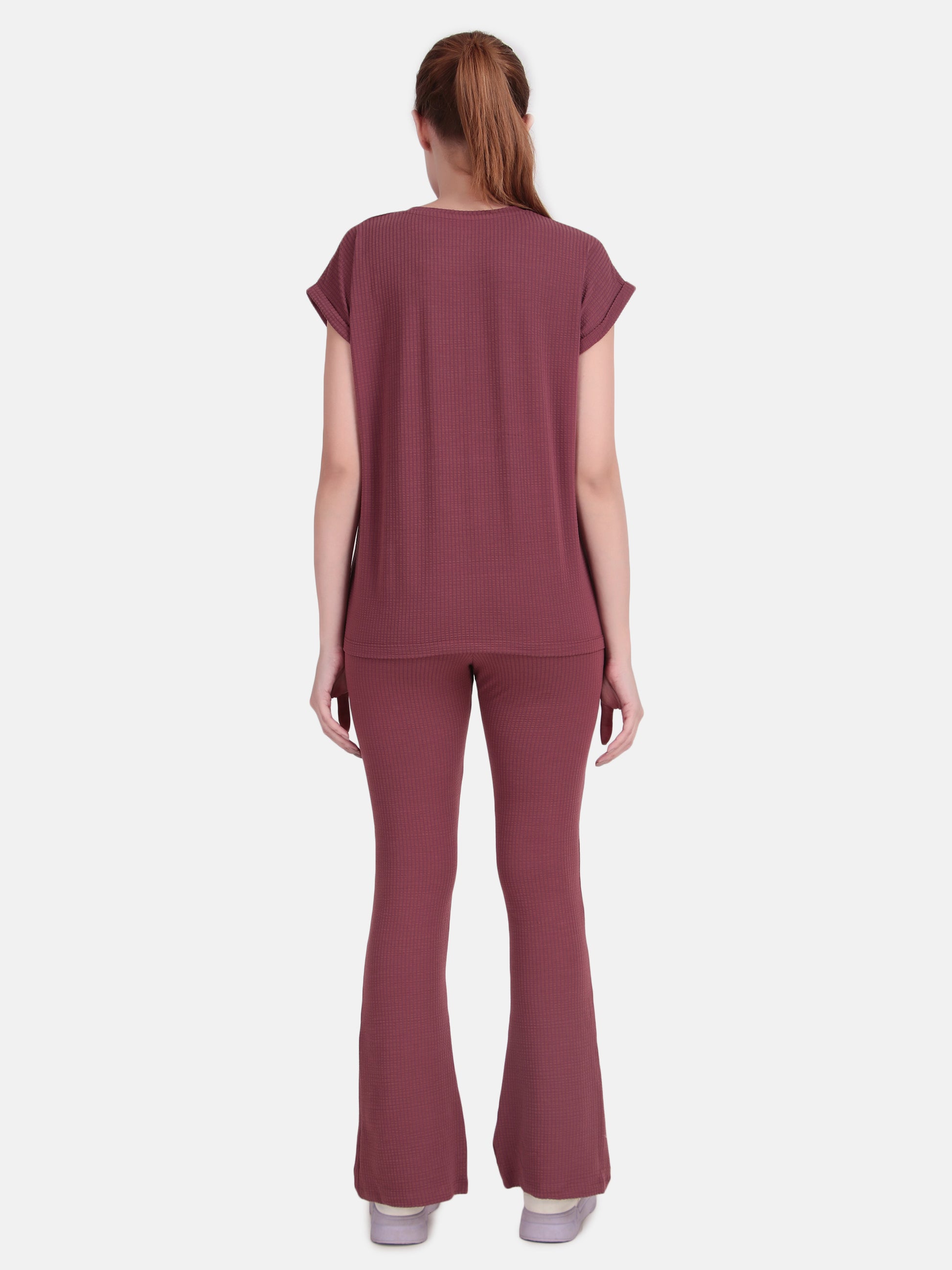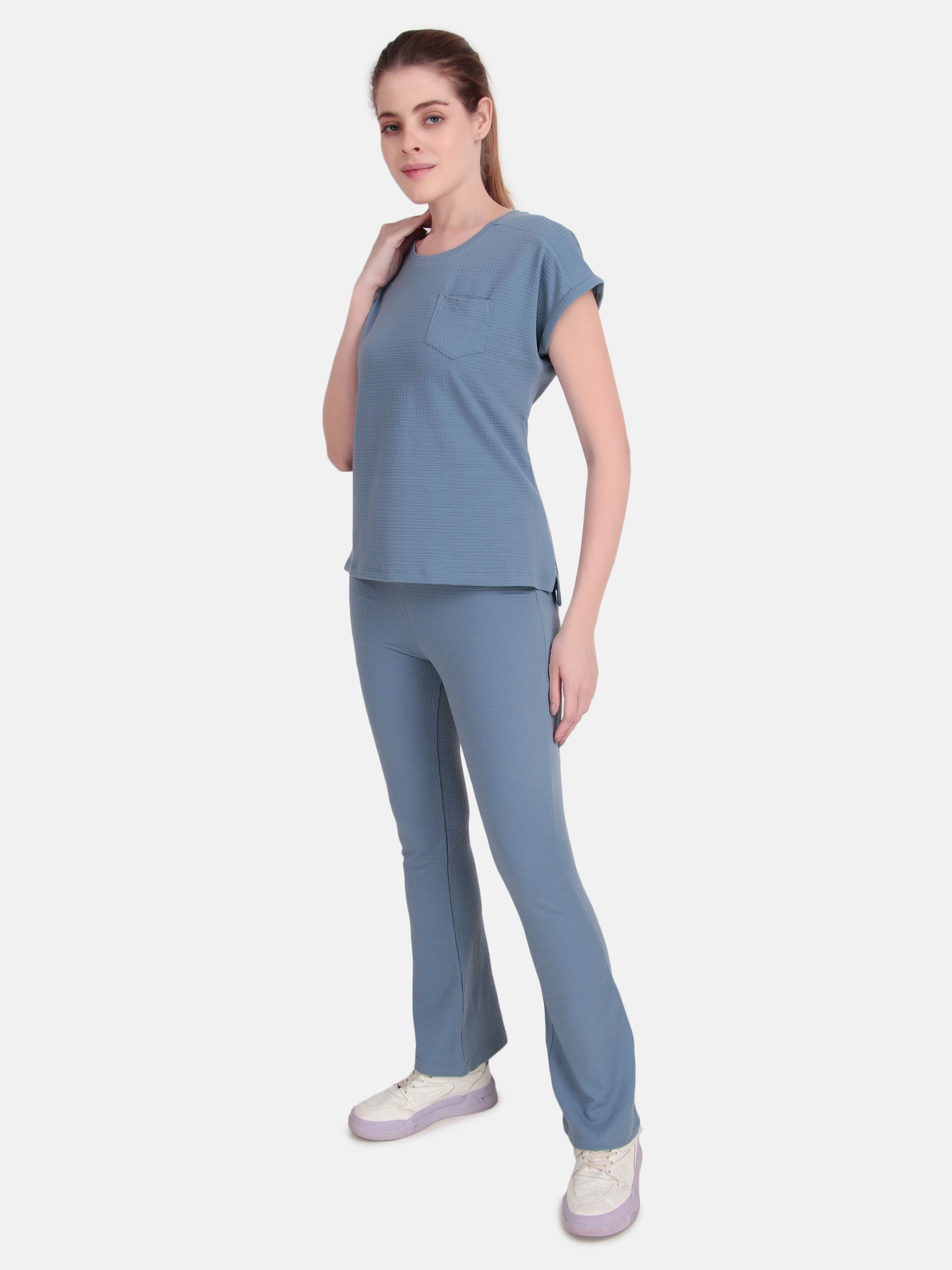 The rolled-sleeve tee with a neat chest pocket brings that casual, sporty edge, while the gently flared pants elongate your frame and let you move freely. Together, they create the perfect harmony of comfort, confidence, and contemporary cool — for workouts, lounging, or everyday wear.